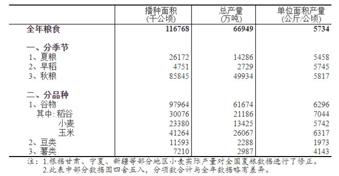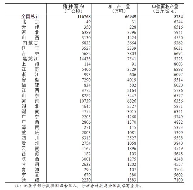 全國糧食總產(chǎn)量為31個省(區(qū)、市)夏糧、早稻和秋糧產(chǎn)量的總和。